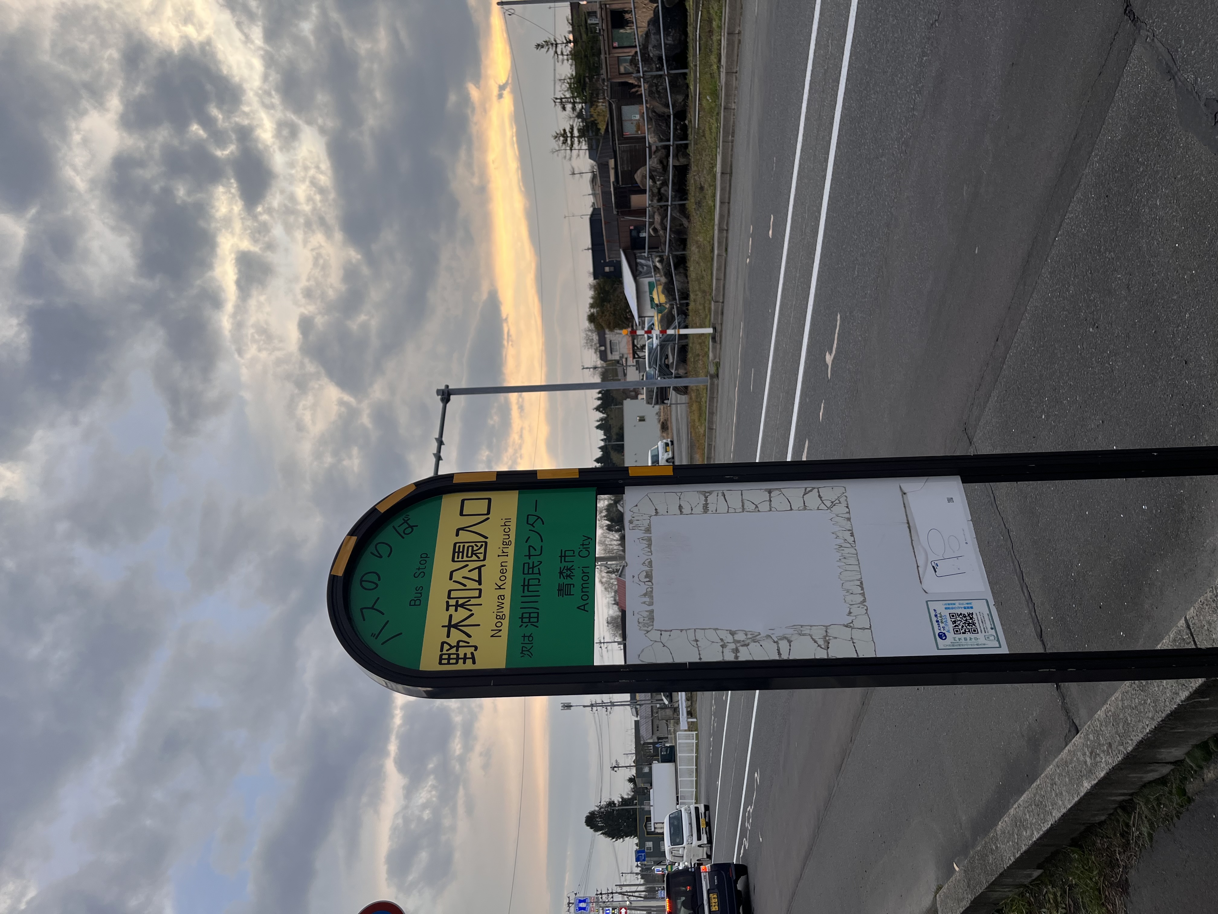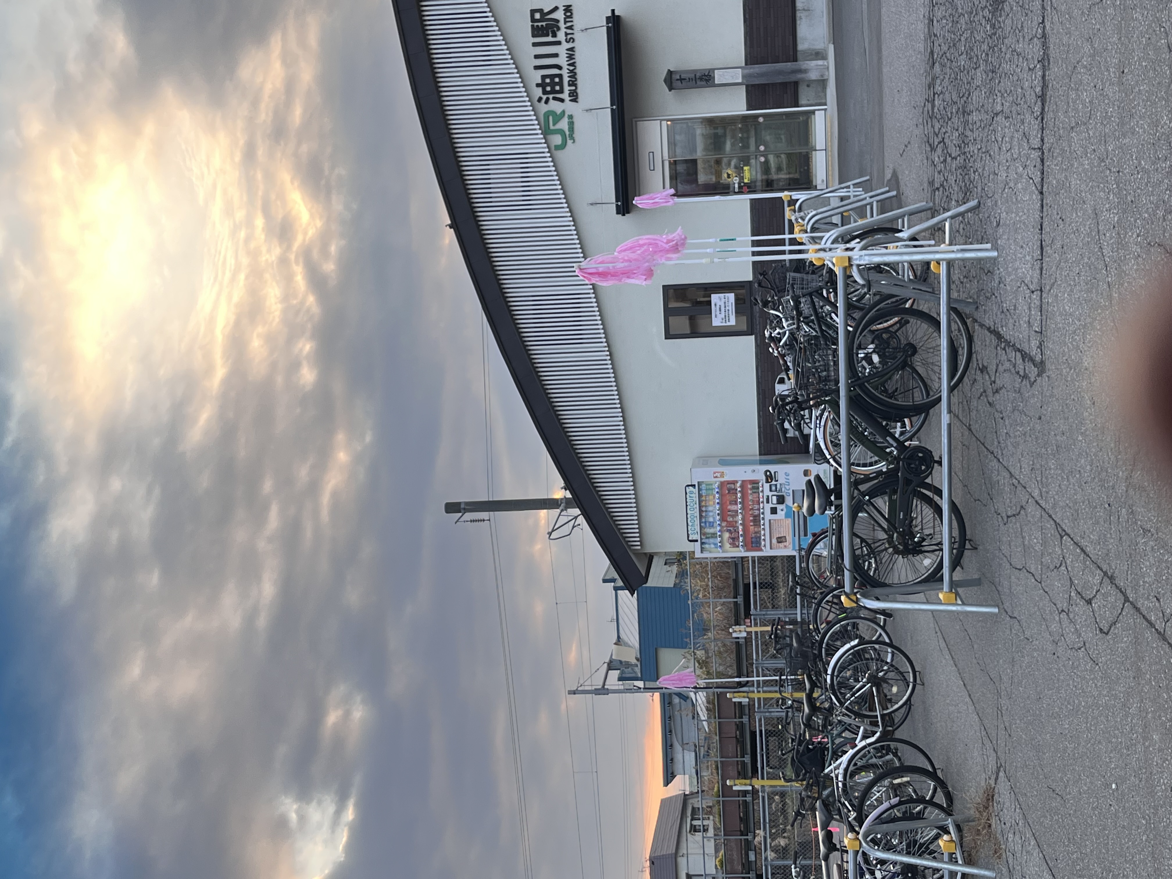 15:32 JR油川駅&JP油川駅上空は日入りの前ぶりが見られます、自転車置き場は冬場の置き場が縮小されるので「持ち帰りのお願い]が告知されています。