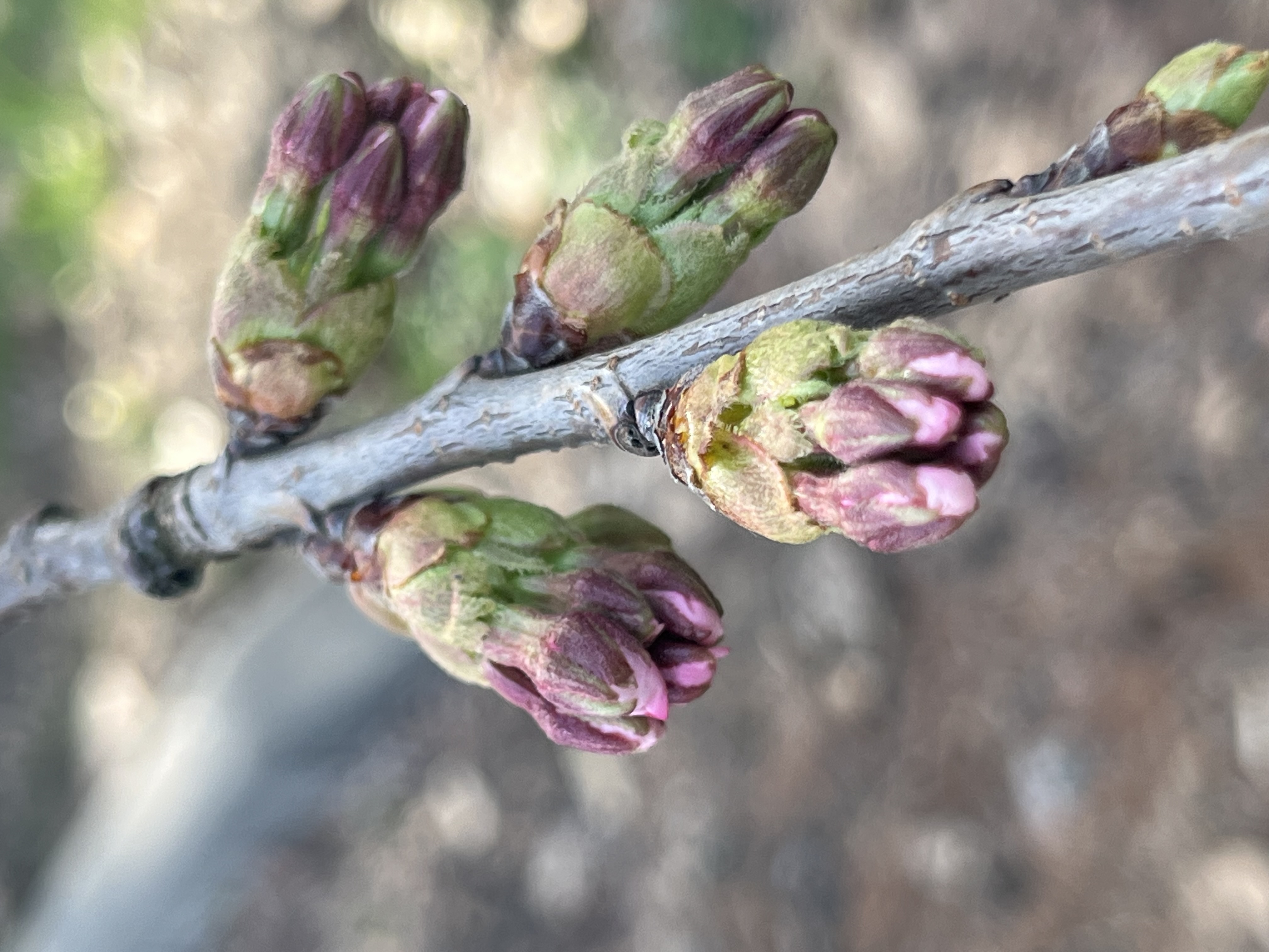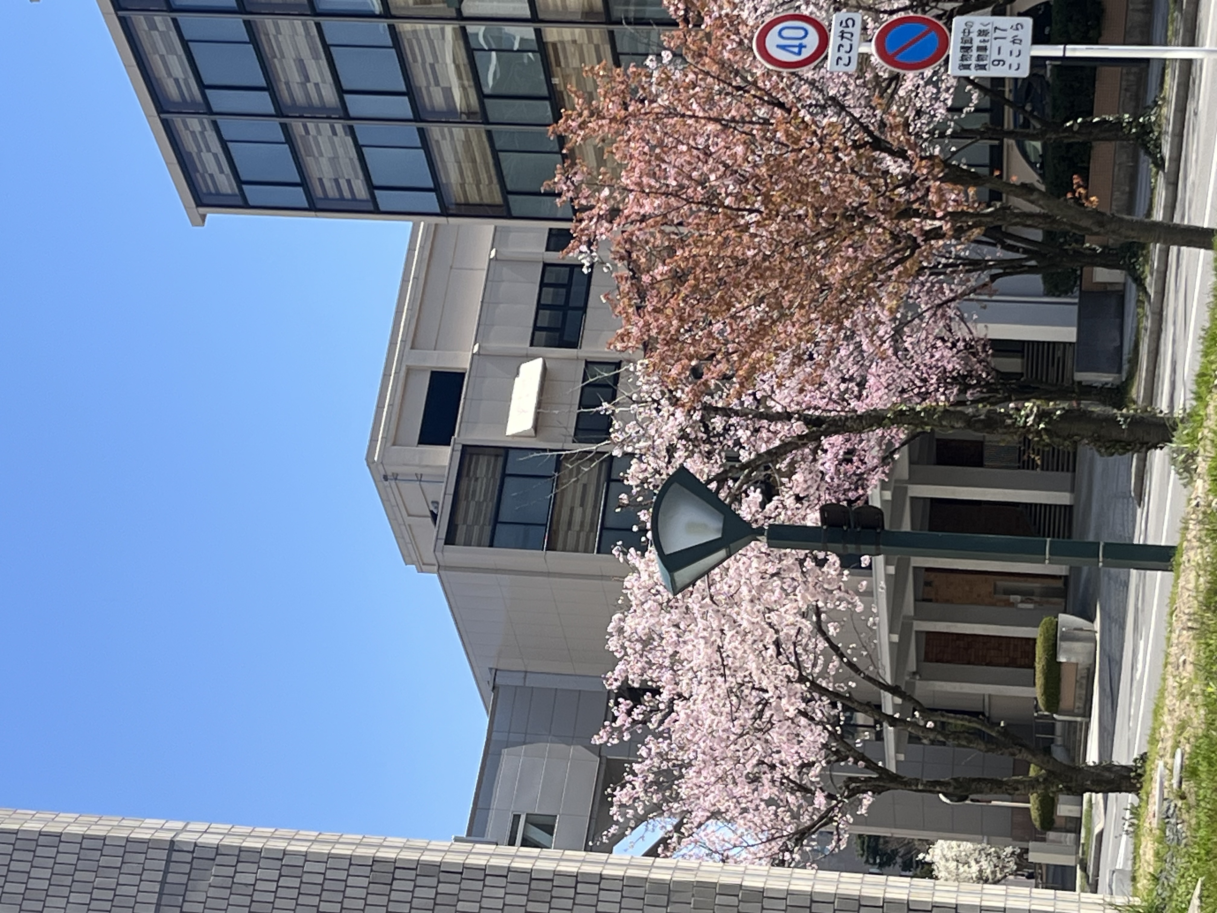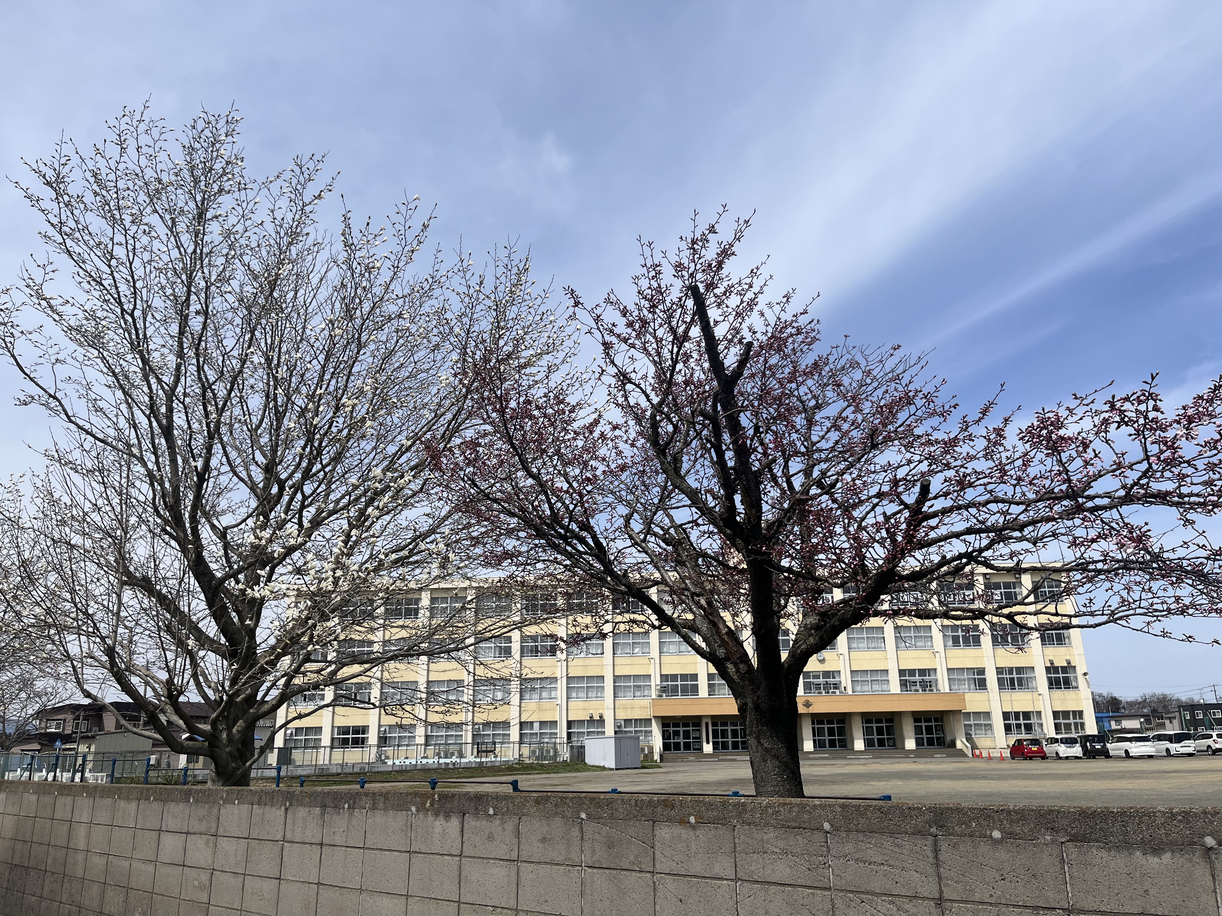 12:45 油川小学校さんの校庭沿いに開花し始めの桜と同じく開花し始めのこぶしの花が 隣り合わせで活かしています。