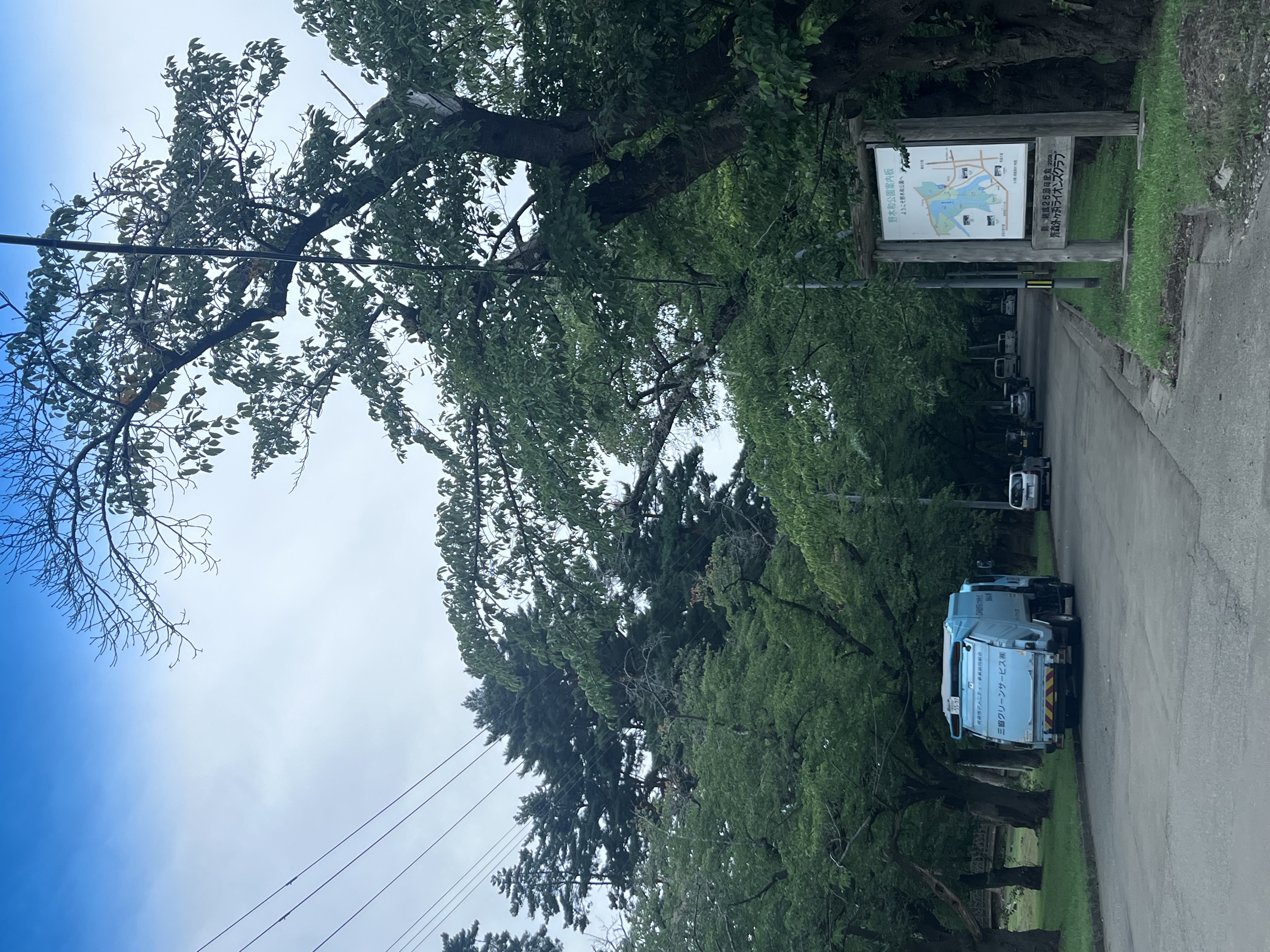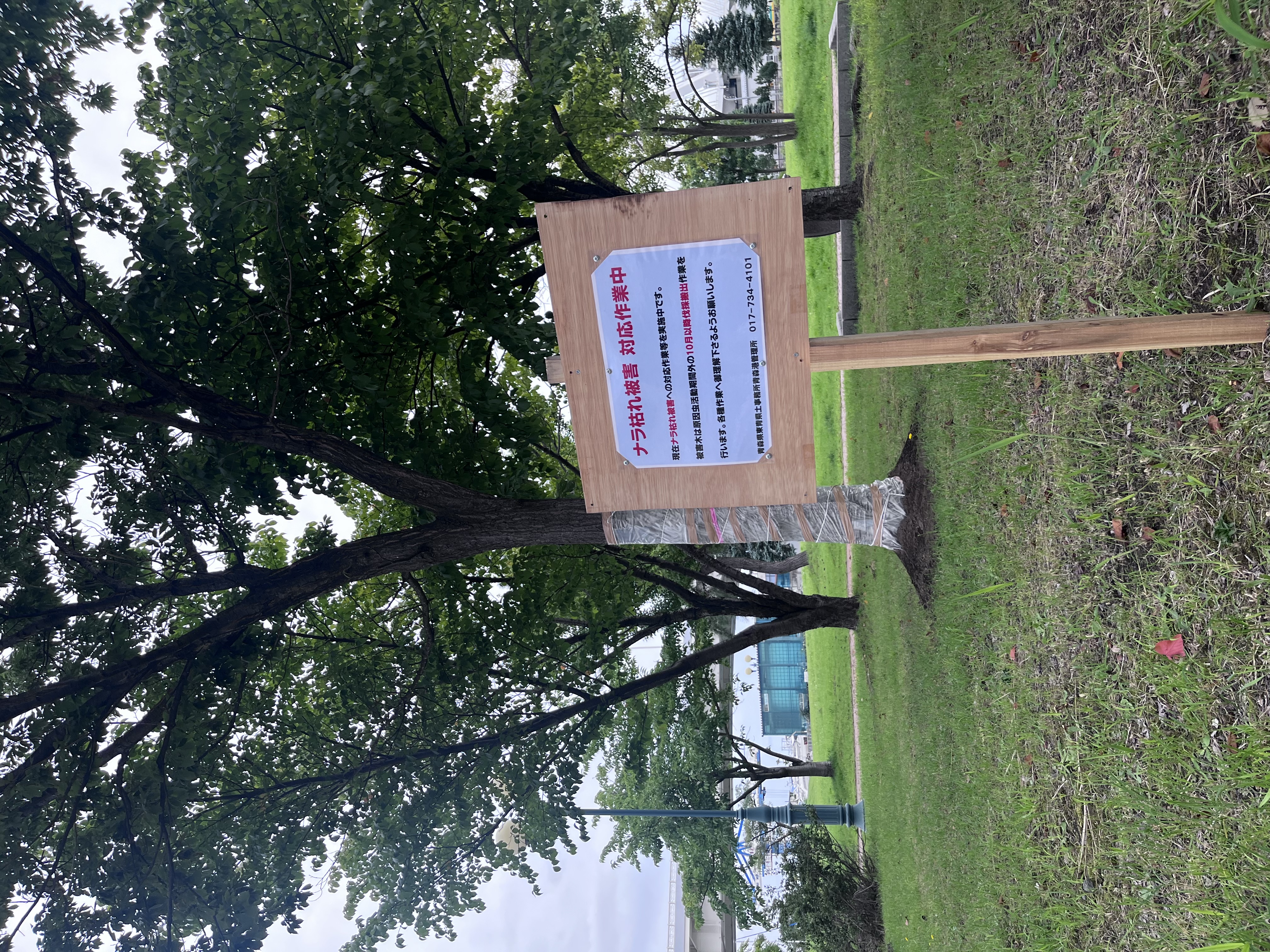 12:09 沖舘地区県営住宅の緑地帯では今話題にもなっている「ナラ枯れ被害 対応作業中」の立て看板が目を惹いています。