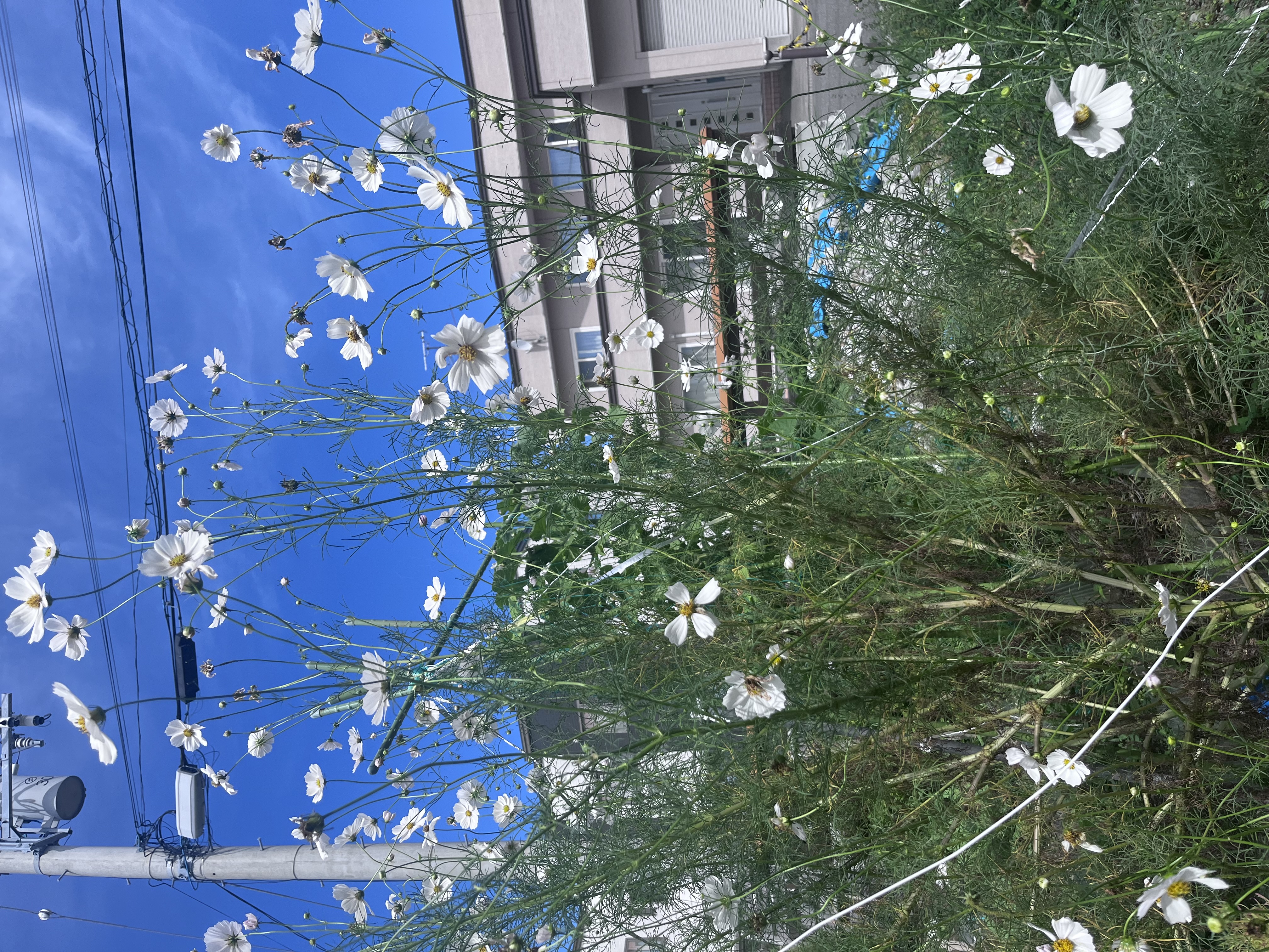 9:57 晴れた秋空に白い花を付けた秋桜が良く映え、とんでもなく日差しは強くても見た目には季節は秋です^_^