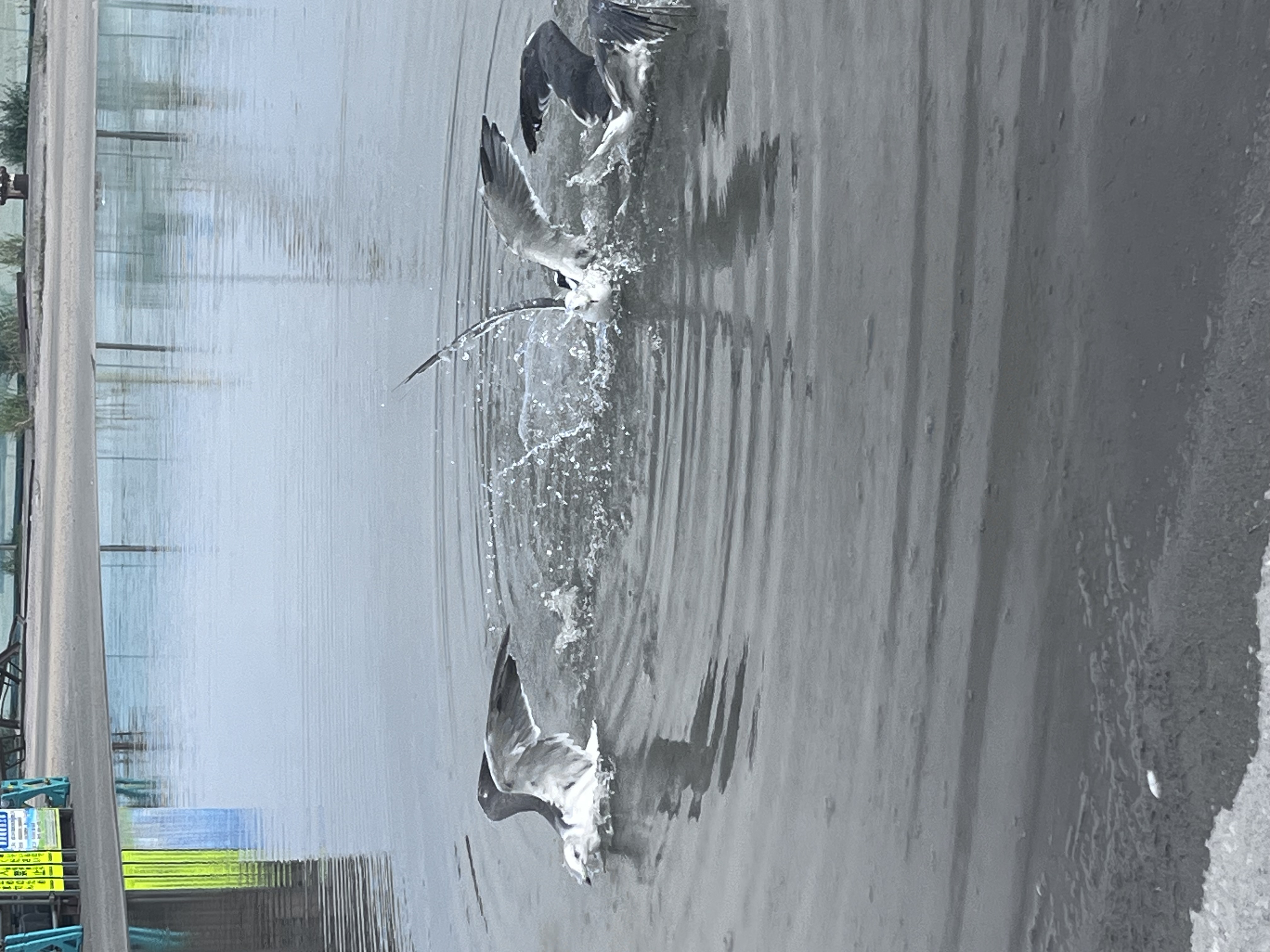 14:38 フェリー埠頭に連なる岸壁では釣り人も沢山見られますが、水溜まりではウミネコが縄張り争いを兼ねて行水中のようです。