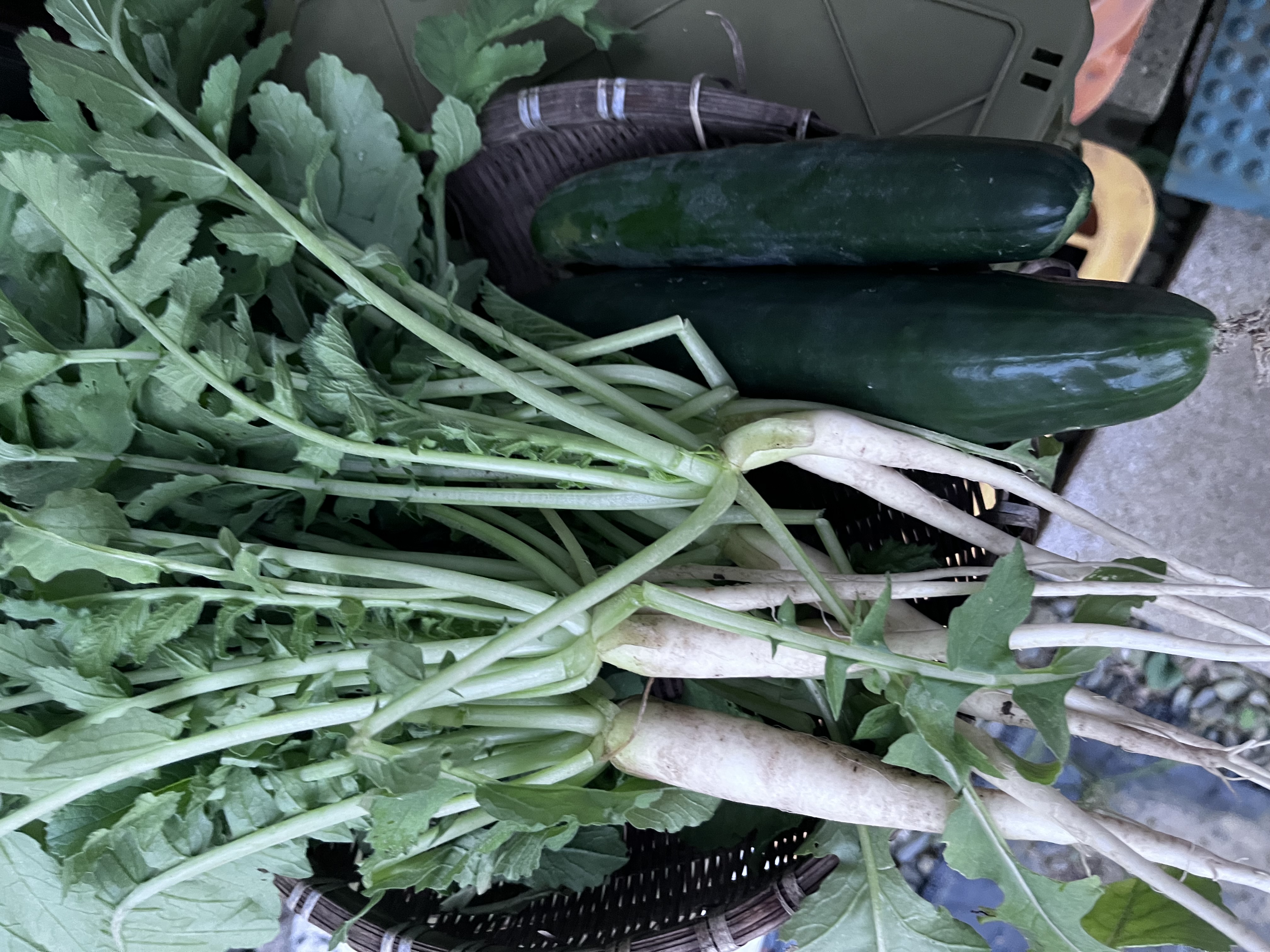 今日の収穫は大根葉・デブきゅうりも無農薬!