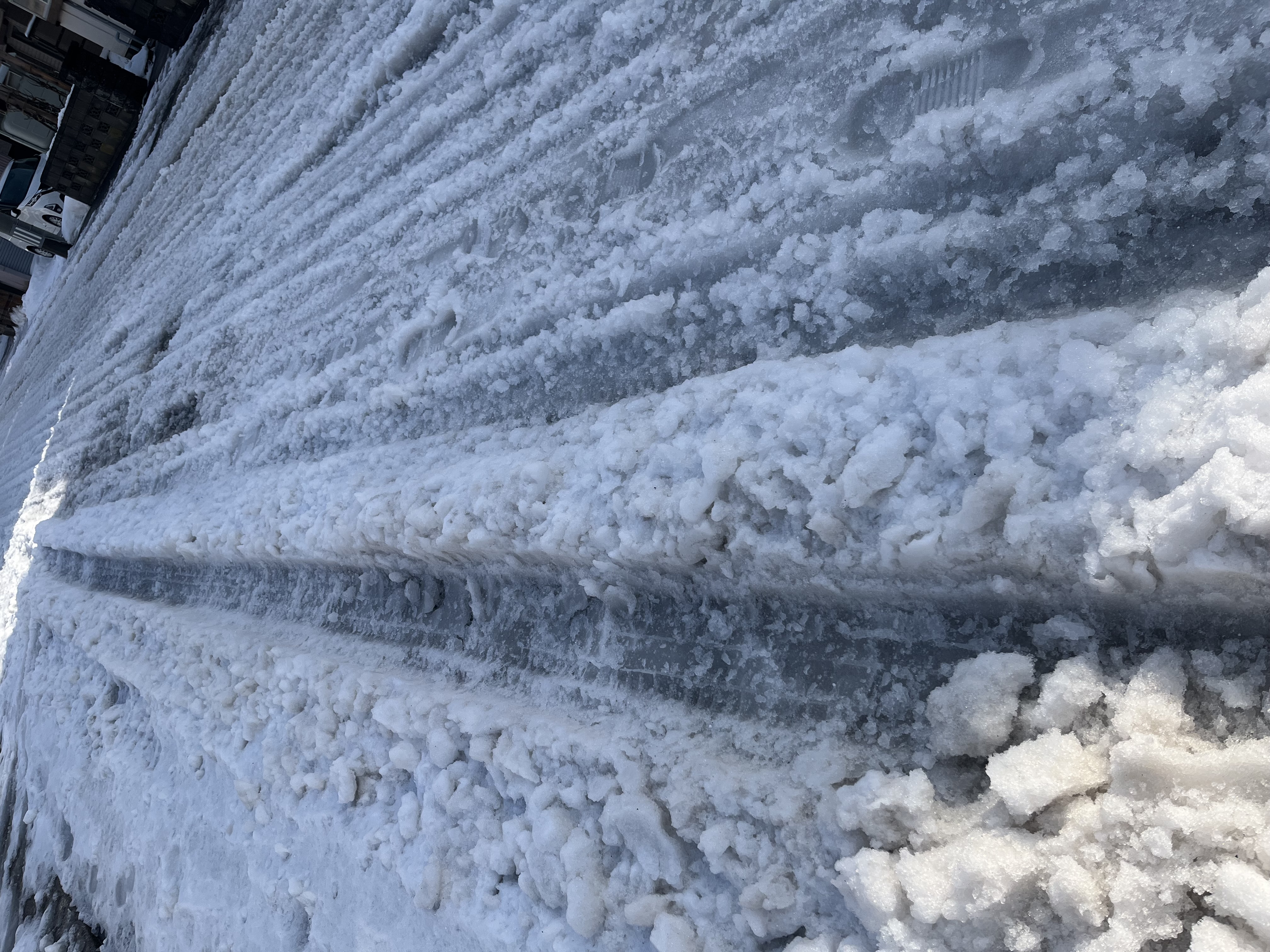 16:03 午前中の生活道路はアイスバーンで危険でしたが、今はぬかるみ&雪で薄化粧され凸凹が歩行者には相変わらず優しくないようです。