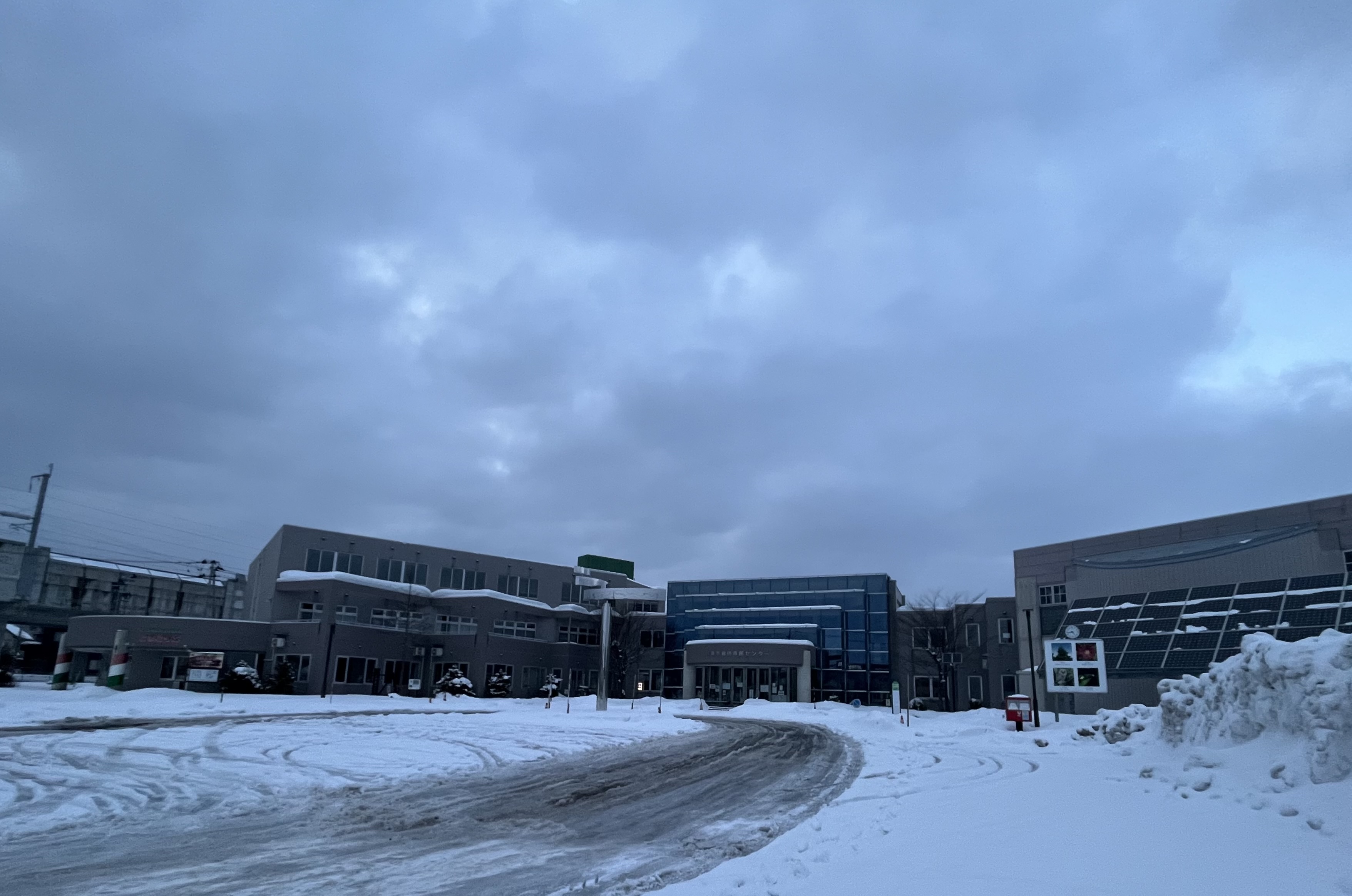 10:45 通所リハビリ先、障害者支援施設「津麦園」さんの正面入り口に着きましたが、普段は一つ手前のT字路から入るのですが、雪の壁に惑わされて入って来てしまいました。(笑)