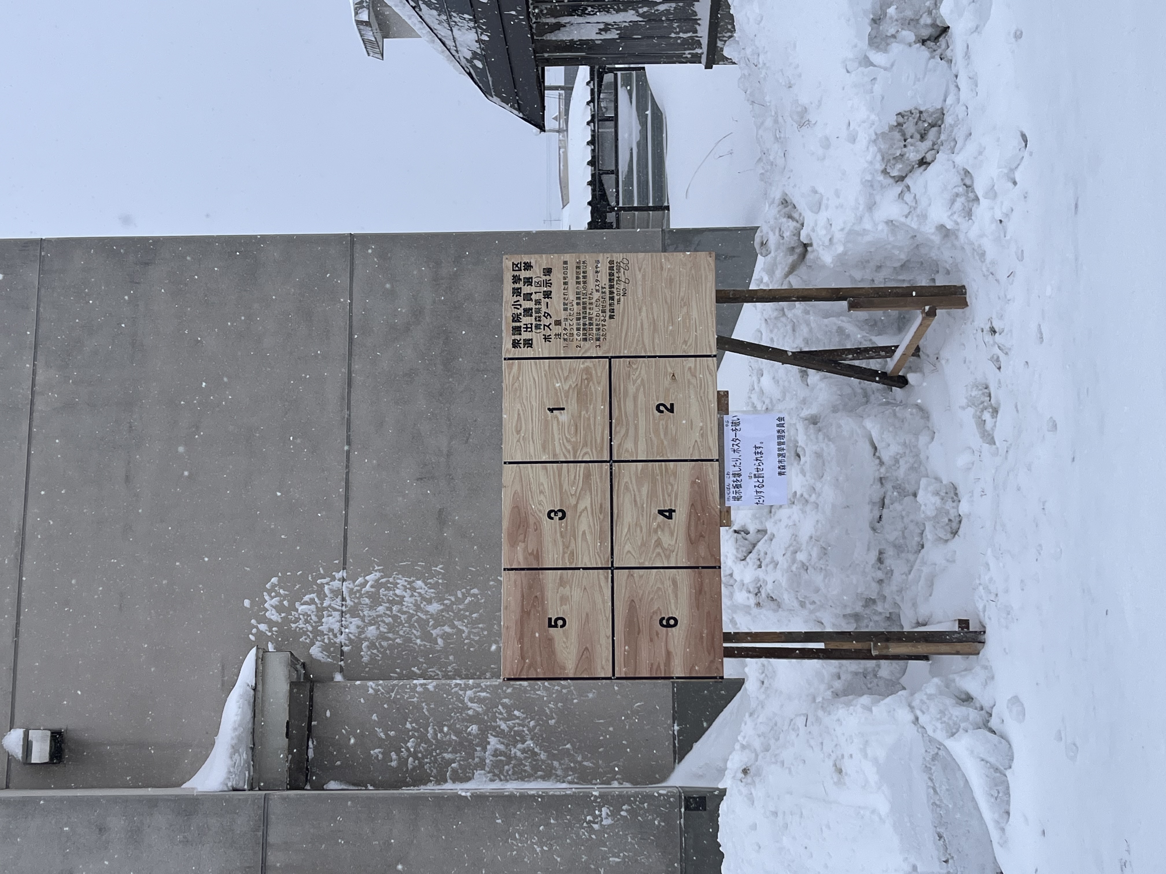 油川市民センター沿いの衆議院選挙の掲示板も同様にこの場所に限らず ドカ雪に埋もれそうで、むしろ各政党の演説ではぜひ青森にお越しいただきたい気分です。