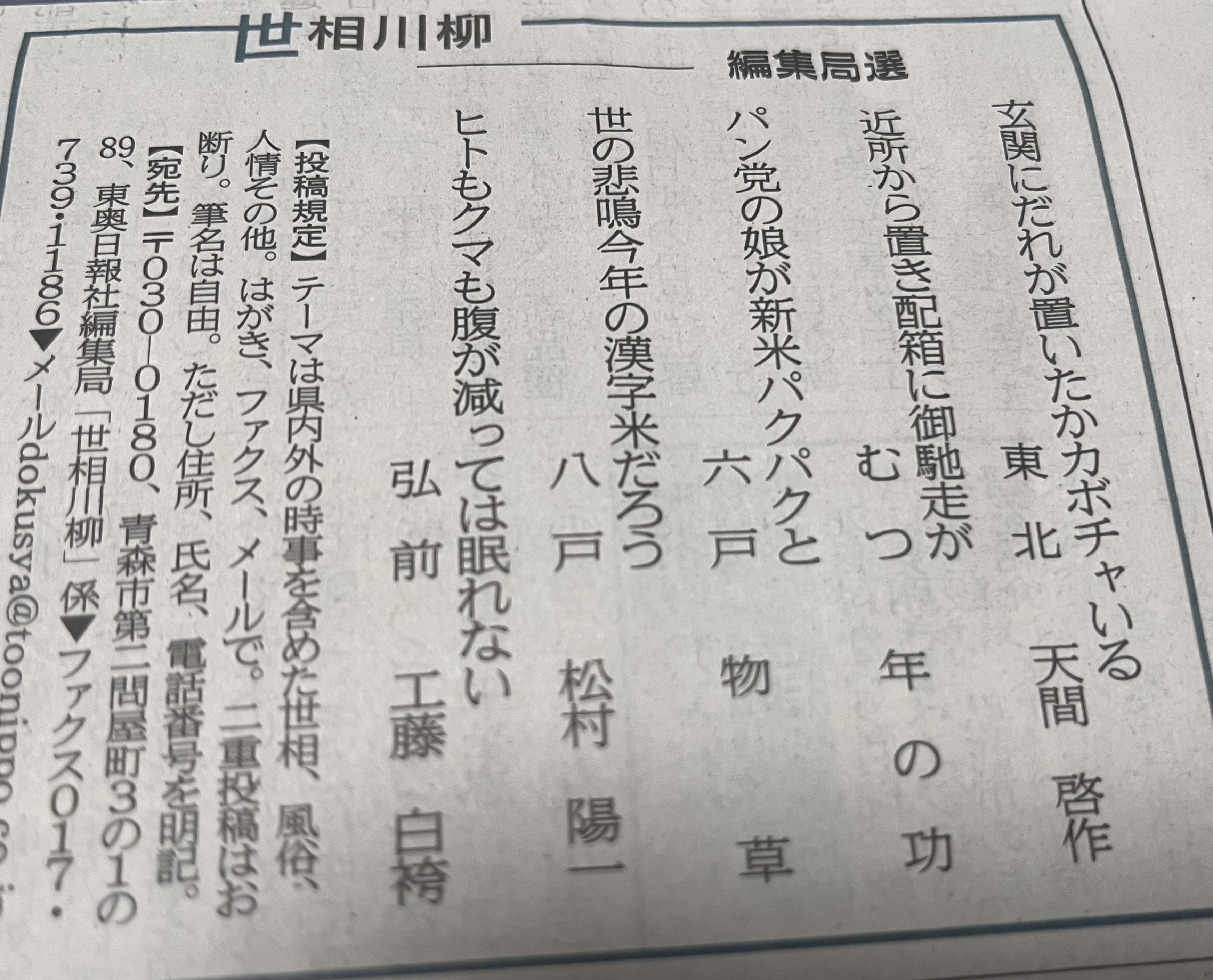 休み明けの東奥日報朝刊・世相川柳は朝のルーティンで気分が和らぎます。