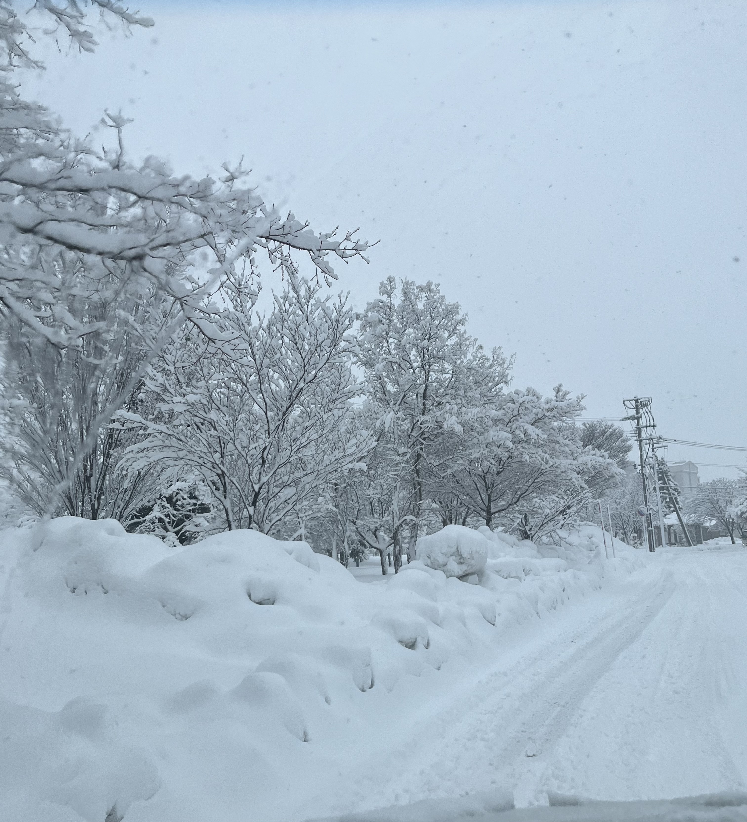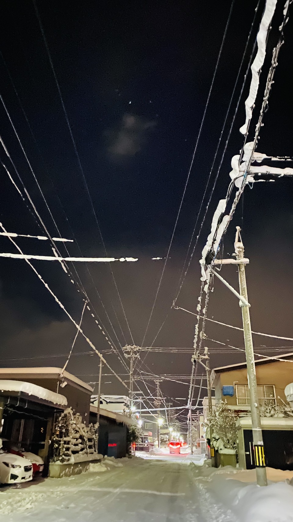 昨日20:51 平和町のバス通りで一段落した夜空を見上げれば電線に積ったふんわりした⛄がいとおしく見えた一瞬です。