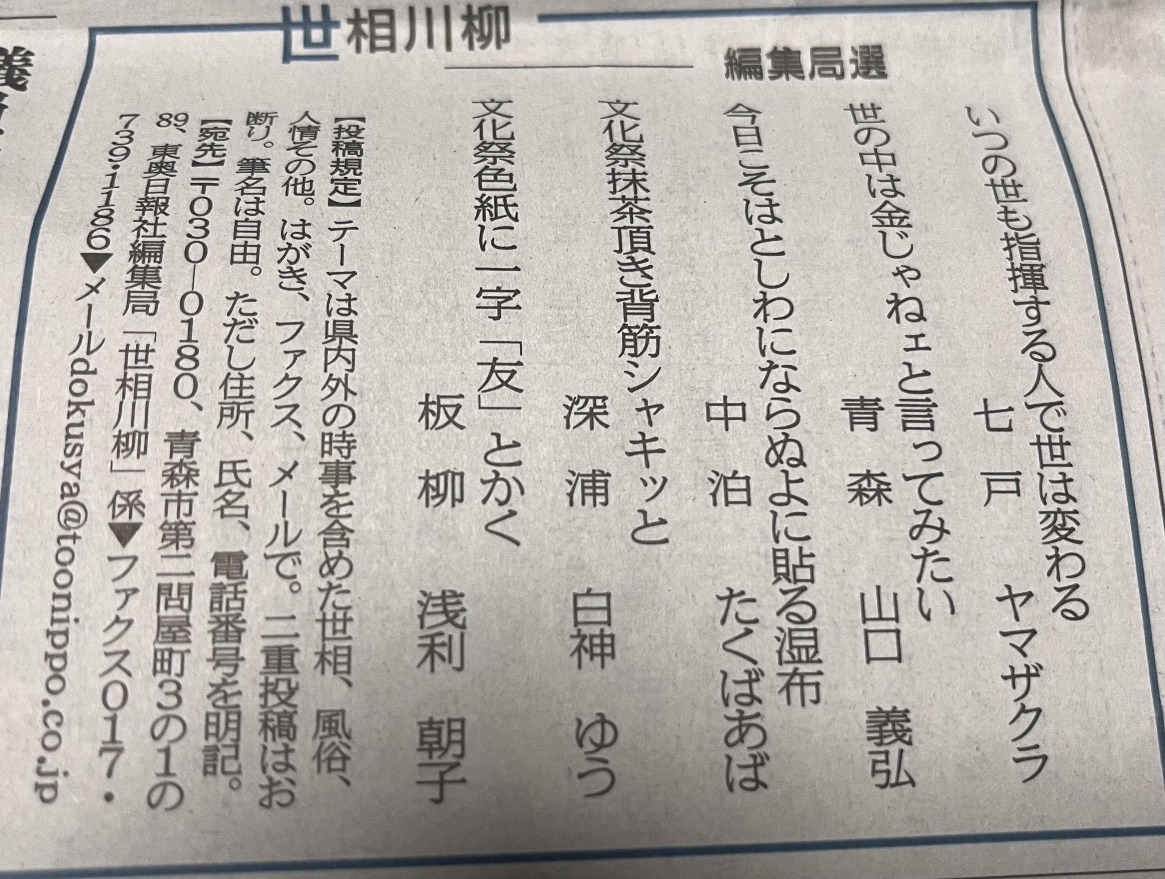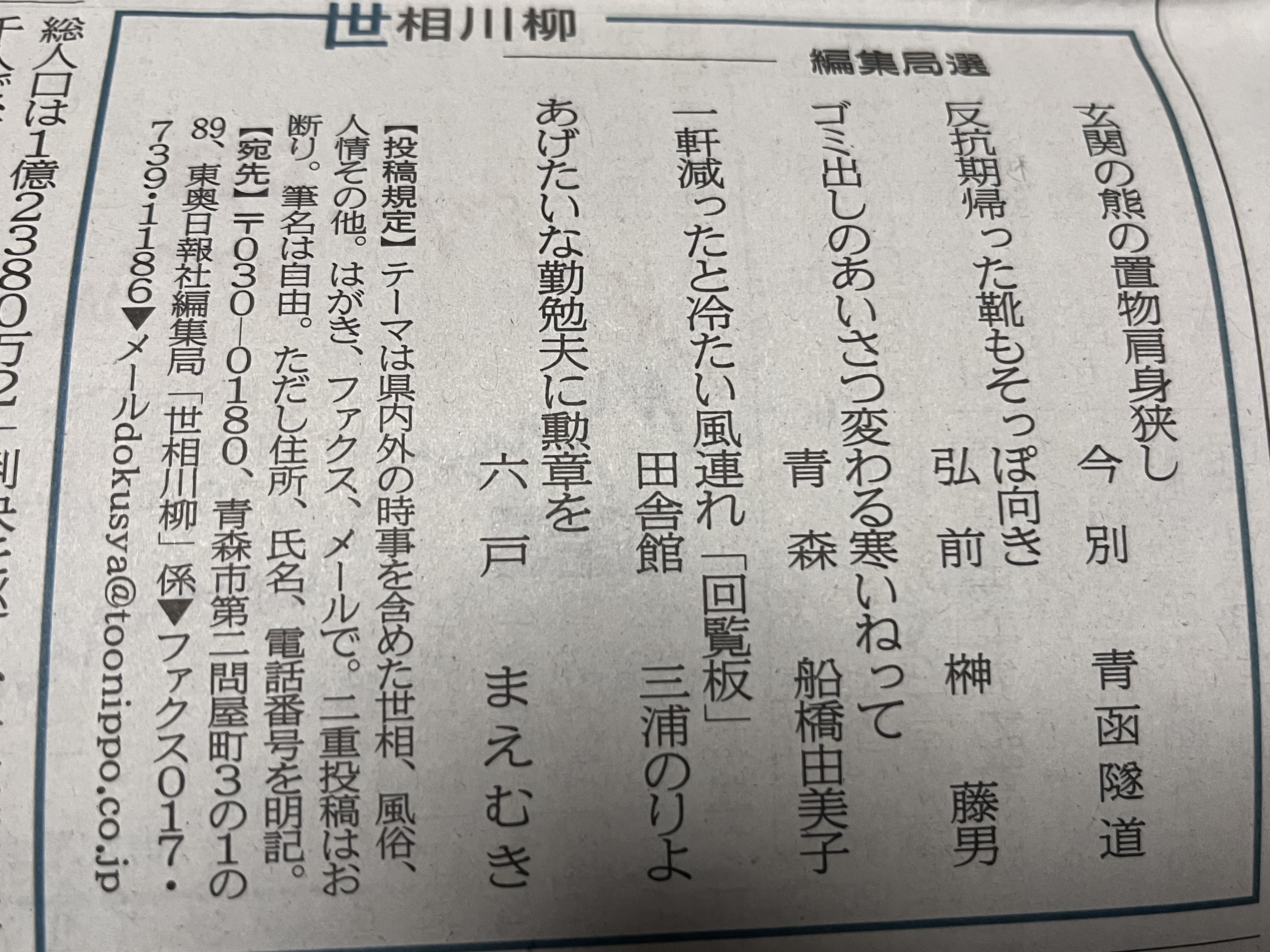 先日同様、東奥日報新聞記事[世相川柳]で.タバコ無しでも一服出来できました。😊
