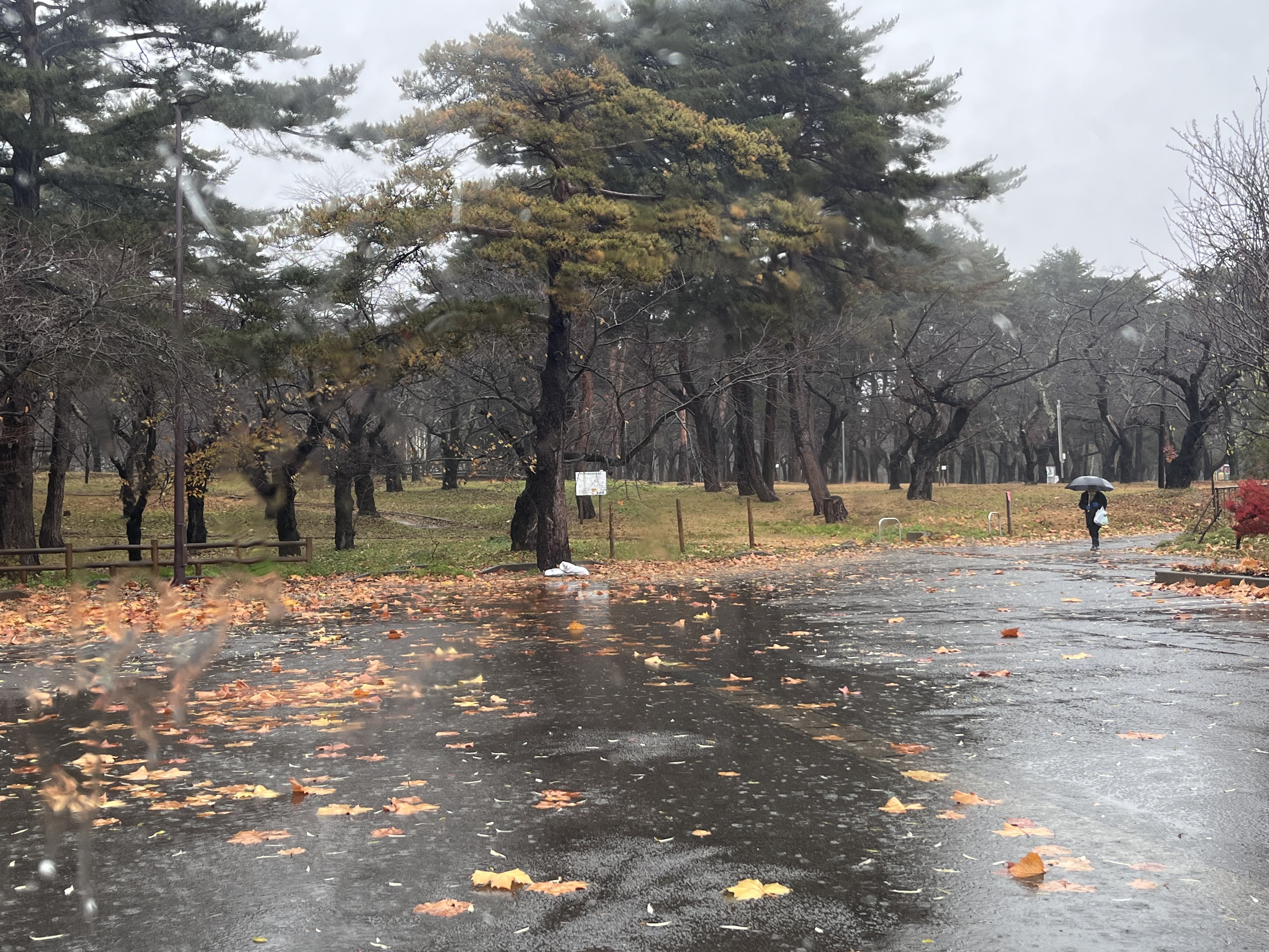 12:31野木和公園🅿の落ち葉は散らかったまま雨に濡れたまま張り付いた状態です。 越冬するつもりだろうか?