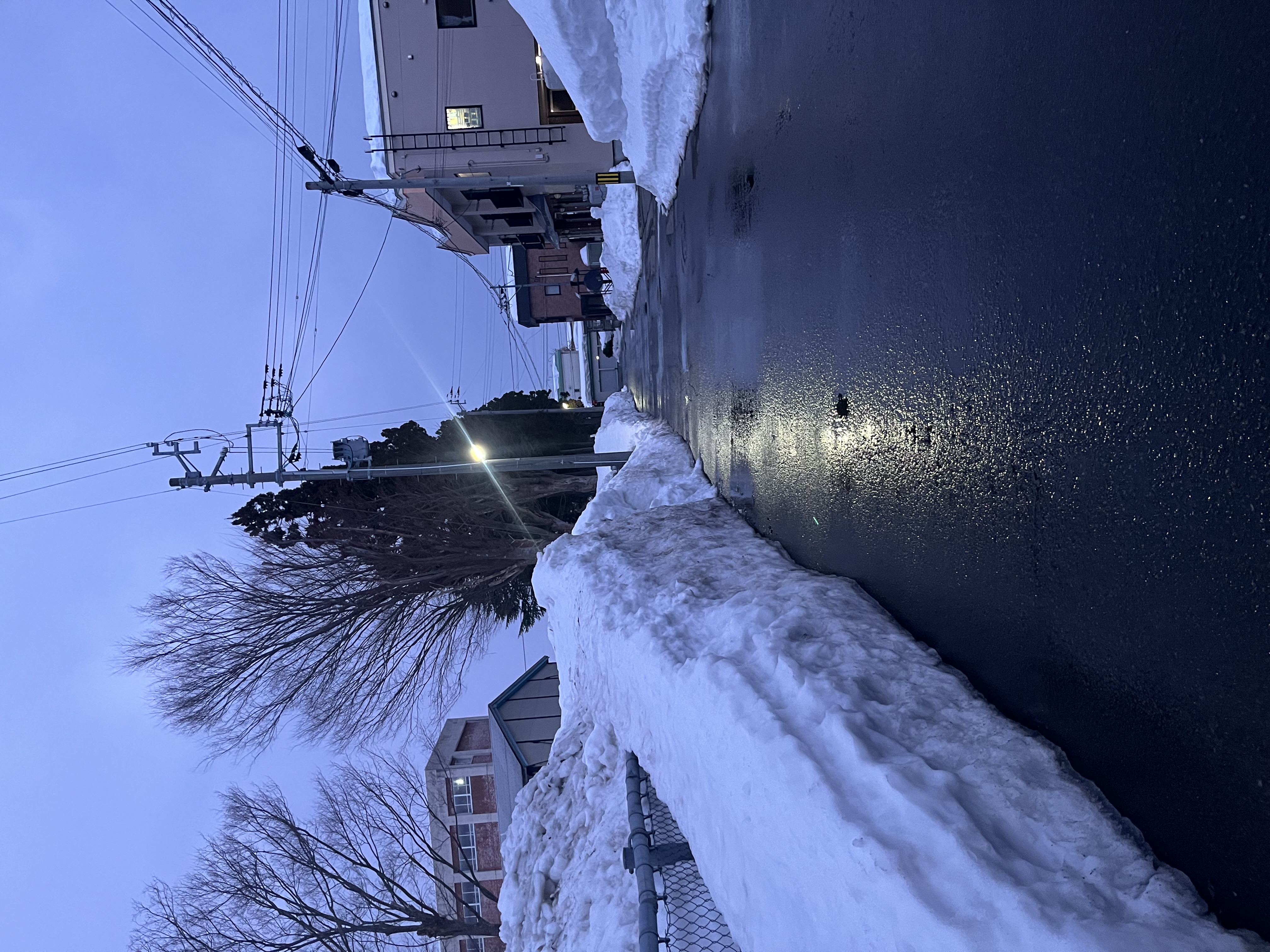 運動不足解消に夕暮れ散歩で「例の同じ場所」では路上が凍結し始めて、一気に冬へ逆戻りした冷え込みです。