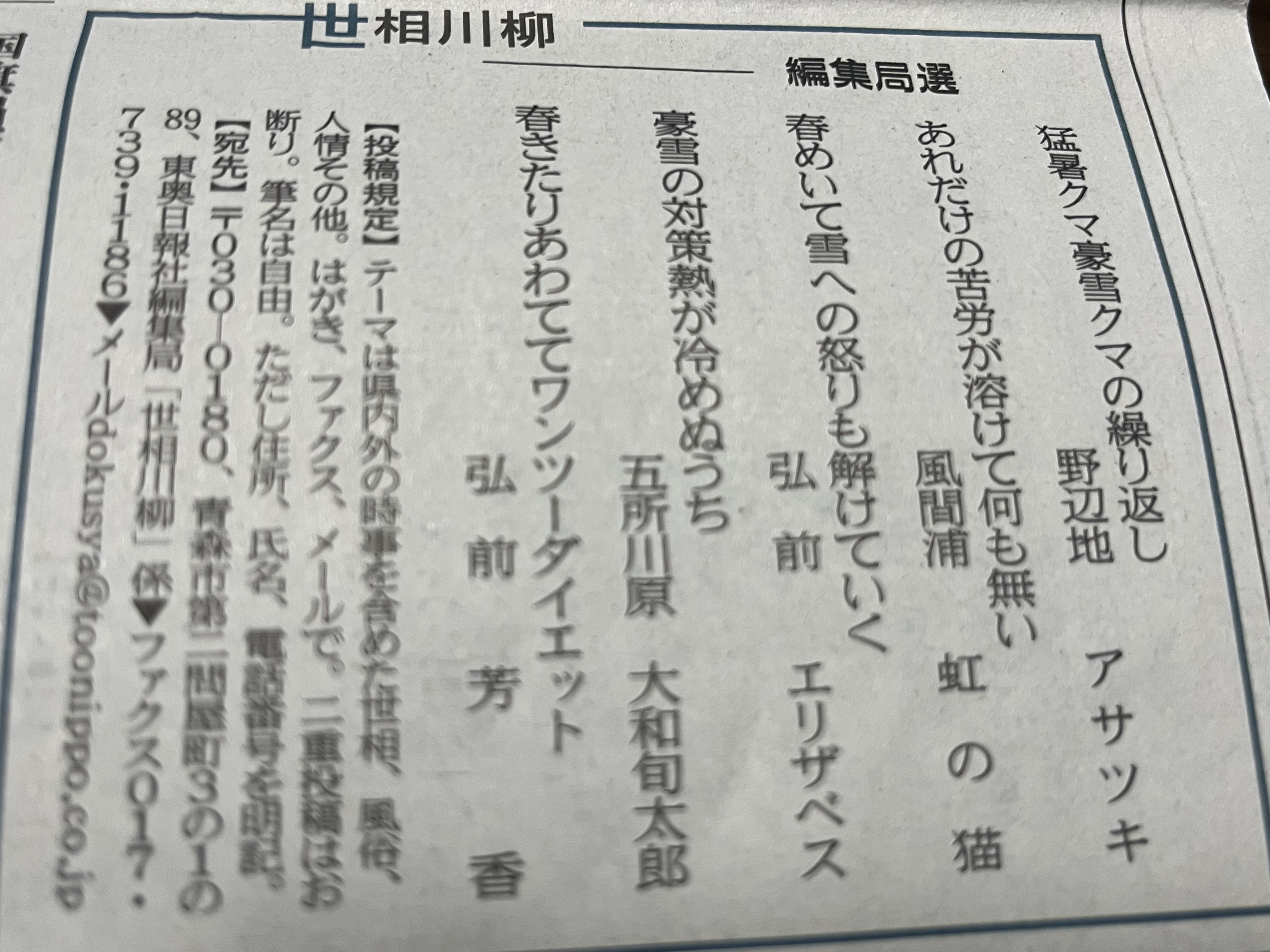 漸くドカ雪が融けた日を忘れないように、一日おいて昨日の活けてる新聞記事から世相川柳を今日 お届けで~す。
