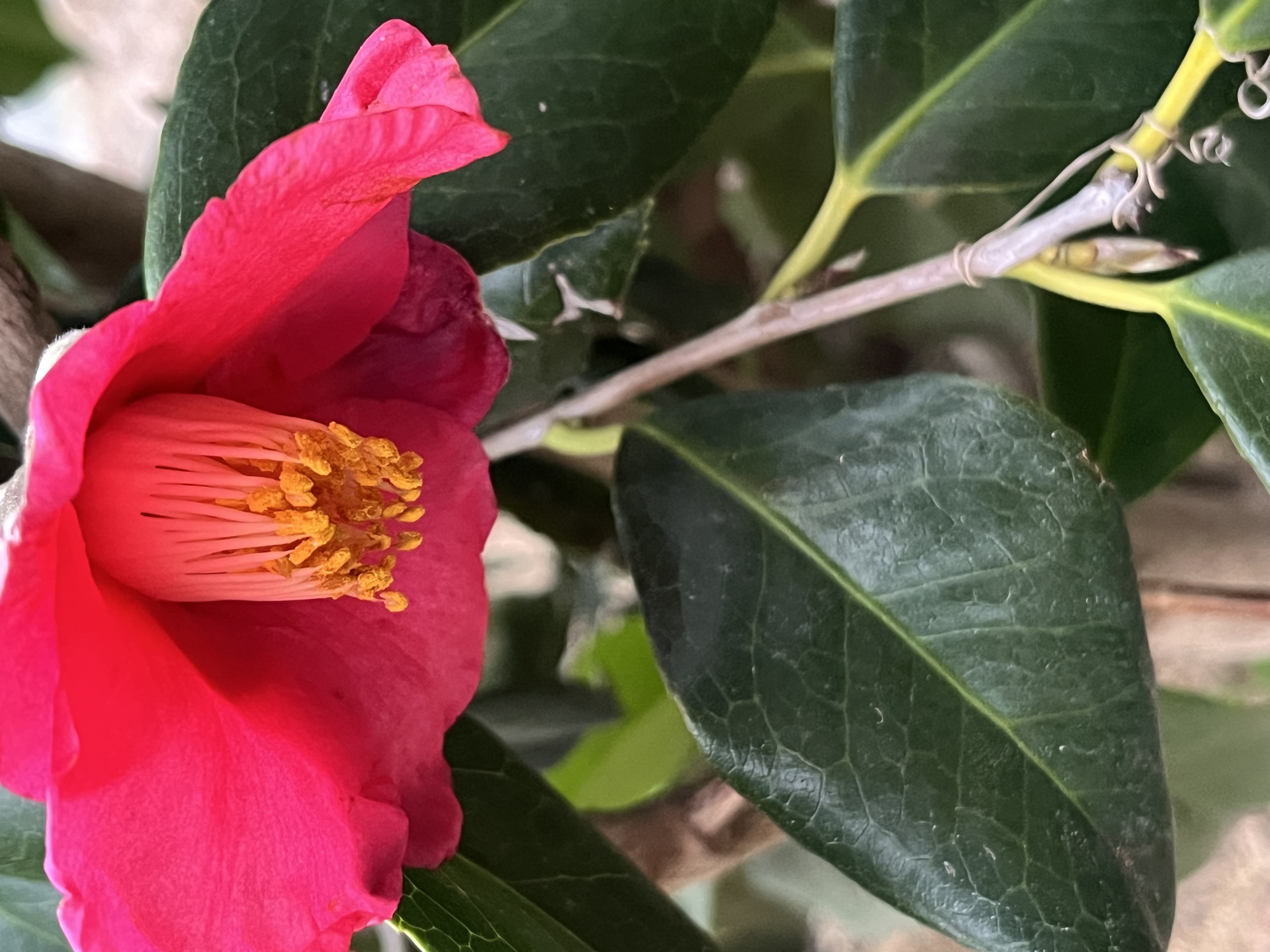 17:36 マイリハビリ菜園内椿の木の雪囲いを外すとまだ蕾もあれば、開花したものもあり人間と一緒かな?と・・(笑咲き)