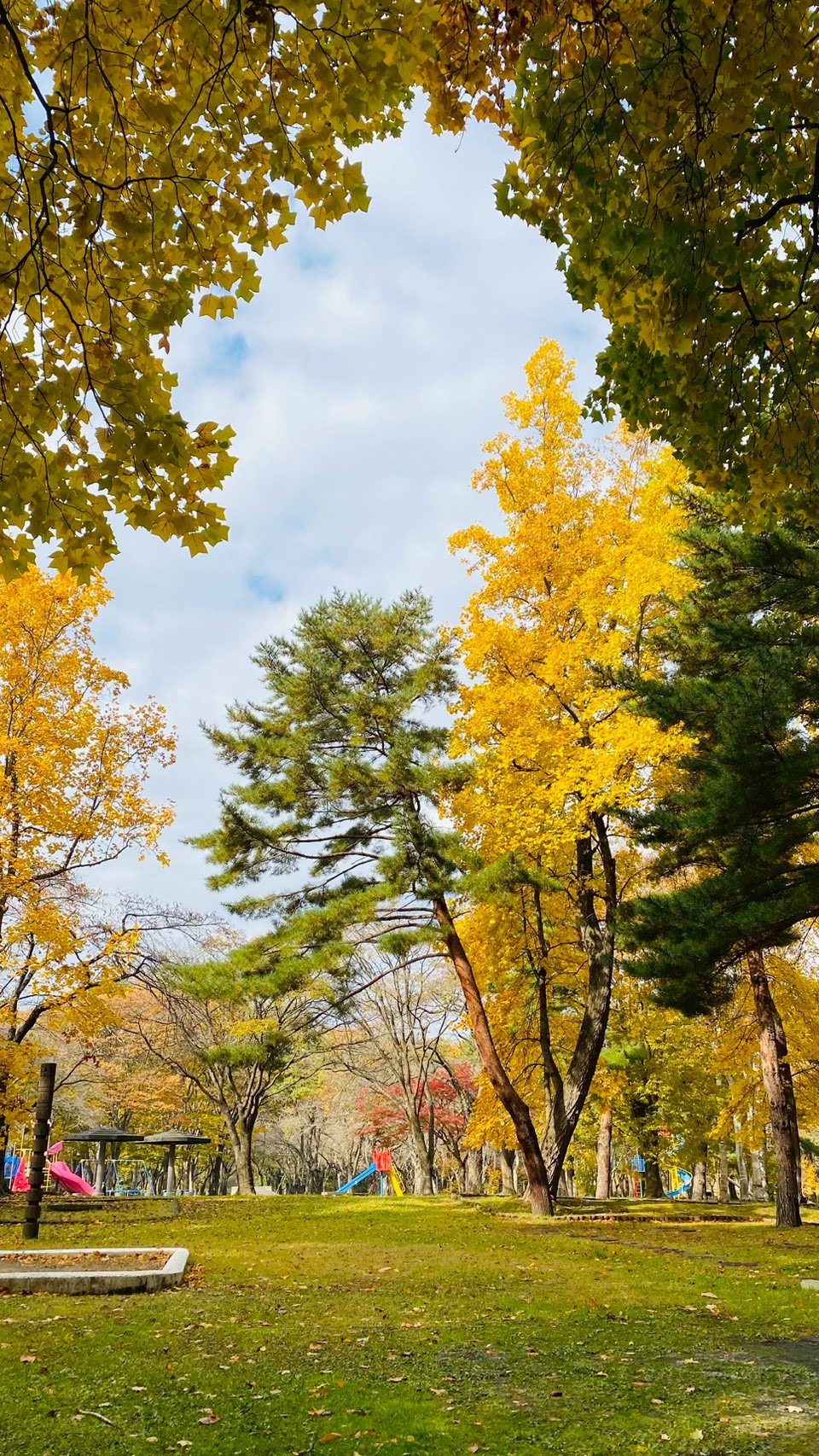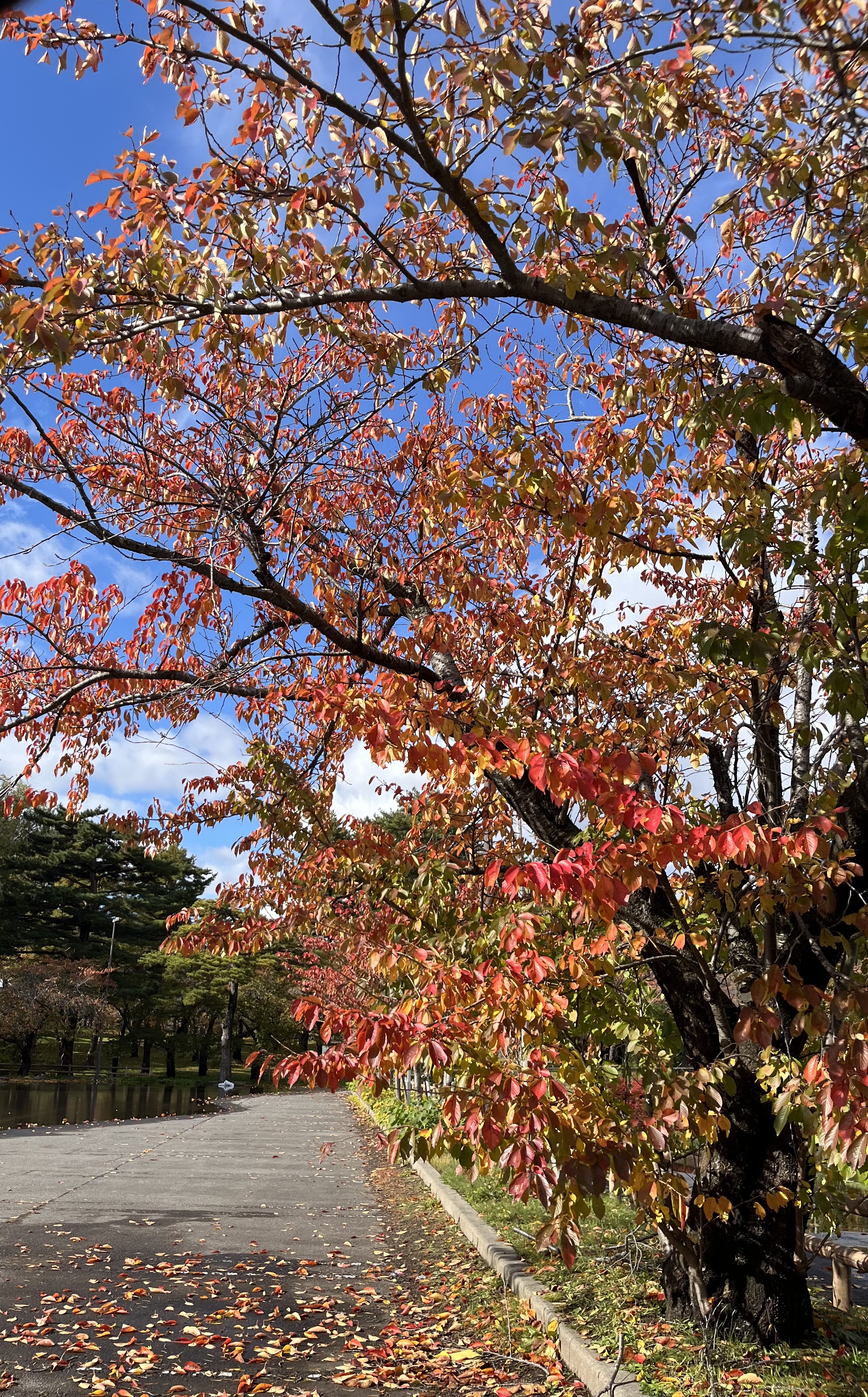 12:09 青森市森林博物館の前庭も目にも鮮やかな紅葉に変身しています。