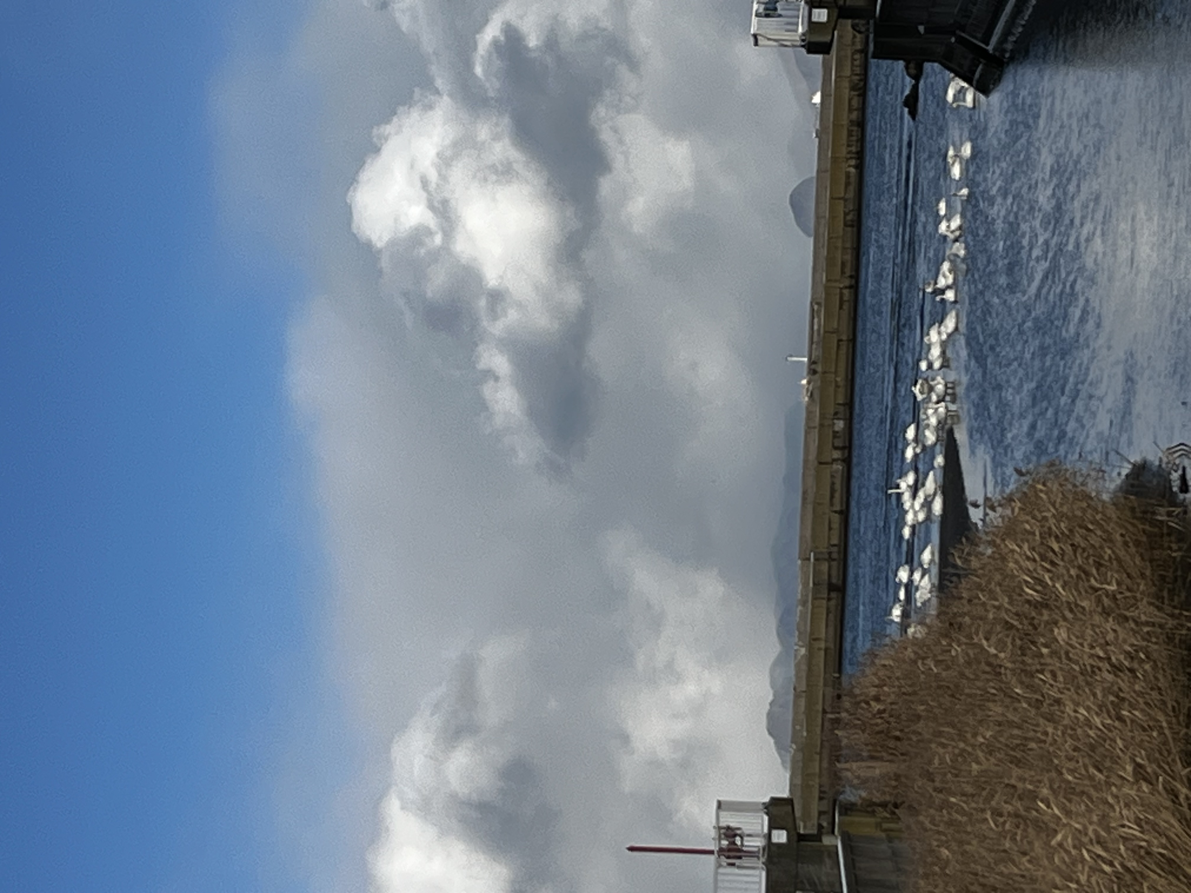 13:50 帰路、天田内川の最終橋、浜の橋から数えきれないほどの白鳥も「忘年会}をしているようです。(笑)